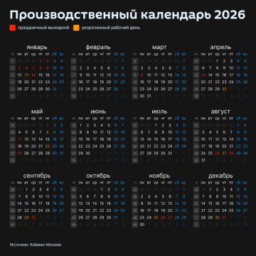 Производственный календарь Абхазии – 2026 годКабмин Абхазии утвердил производственный календарь на 2026 год.В январе республику ждет 17 выходных дней.Также из-за совпадения выходных и праздничных нерабочих дней дополнительным днями отдыха станут 9 марта, 13 апреля, 11 мая, 25 мая, 27 ноября.Дату...
