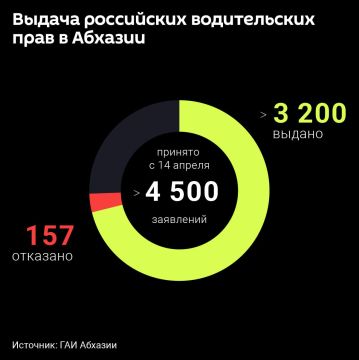 Более 3,2 тысячи водительских прав российского образца выдали в Абхазии. Всего с 14 апреля было принято 4522 заявления, изготовлено 4074 водительских прав, выдано на руки 3204. По 157 заявлениям поступил отказ. Отказы в выдаче водительских прав...