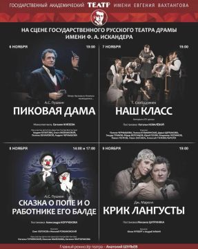 6, 7 и 9 ноября на сцене РУСДРАМа российские артисты покажут спектакли "Пиковая дама", "Наш класс" и "Крик лангусты".Для детей 8 ноября пройдет два показа "Сказки о попе и работнике его Балде".В...
