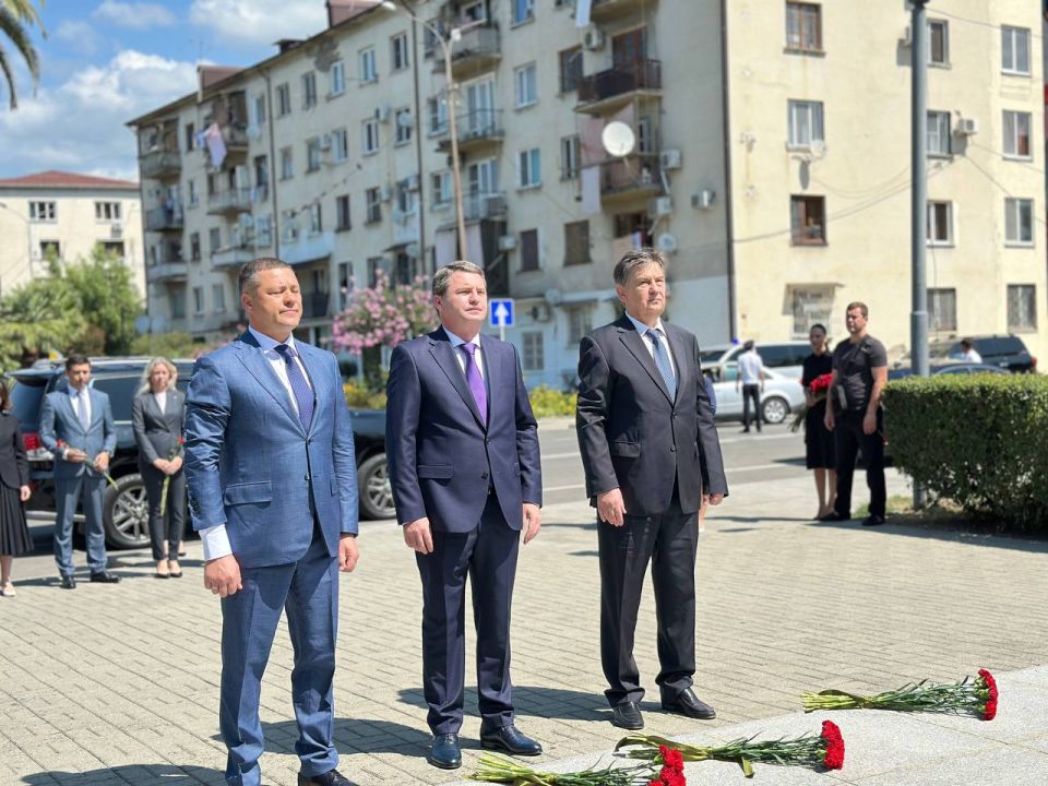 Делегация Псковской области, возглавляемая с губернатором Михаилом Ведерниковым, возложила цветы к памятнику военнослужащим Вооруженных сил Российской Федерации, выполнявшим миротворческую миссию в Абхазии (1994 - 2008 гг.).