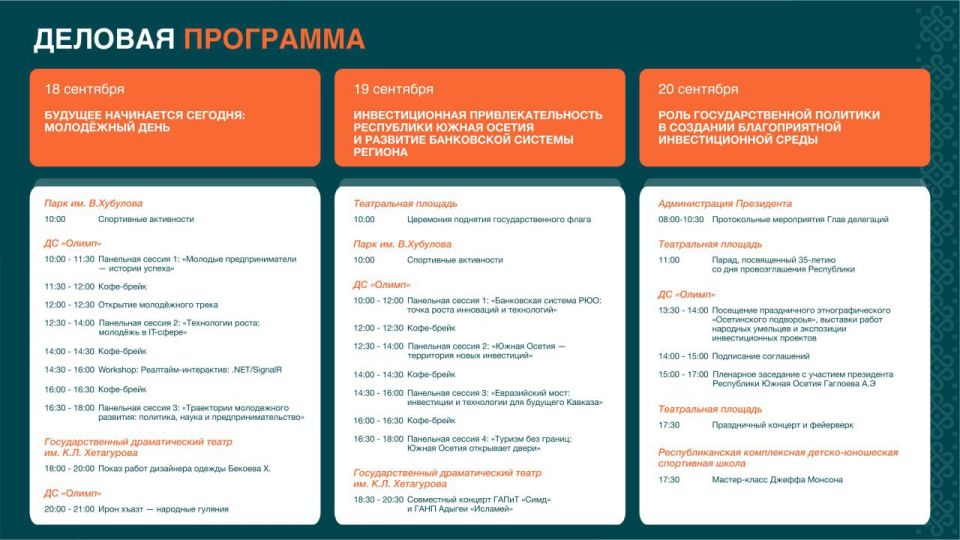 20 сентября форум будет приурочен к 35-летию провозглашения независимости Республики Южная Осетия. Ключевым событием станет пленарное заседание с участием Алана Гаглоева, на котором обсудят приоритетные инвестиционные проекты, сотрудничество с РФ и международными партнерами.