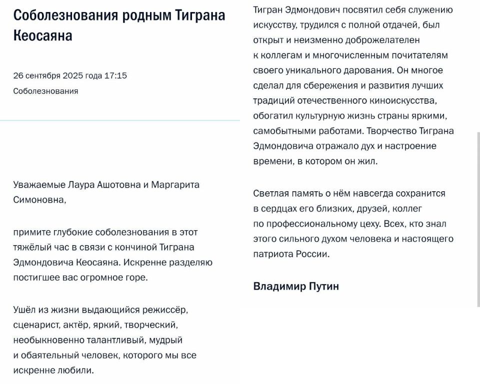 Президент России Владимир Путин выразил соболезнования родным и близким Тиграна Кеосаяна.