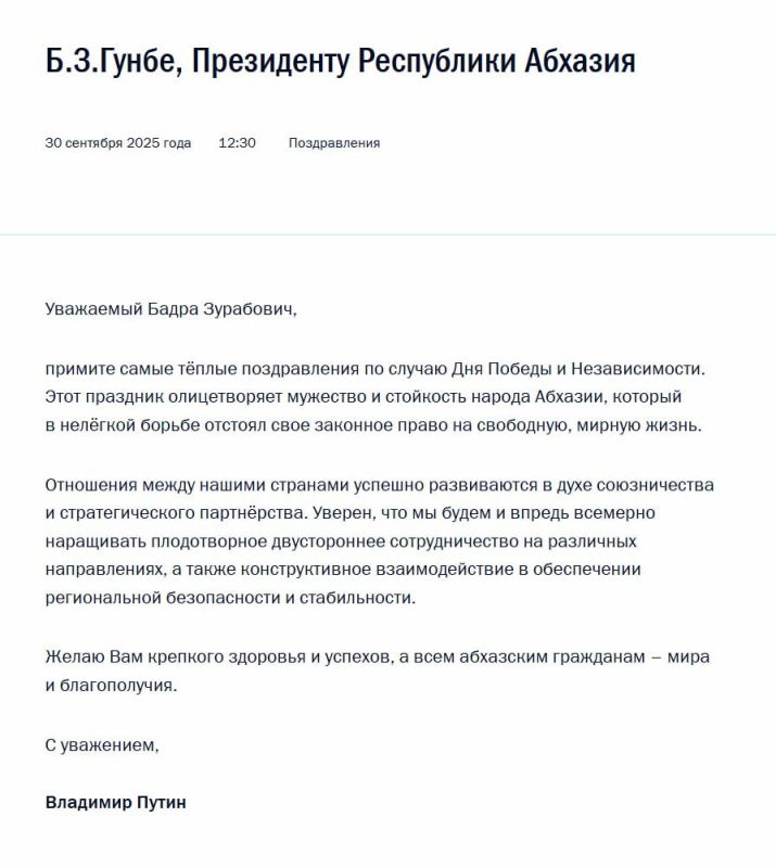 Глава РФ отметил мужество и стойкость народа республики, а также пожелал абхазским гражданам мира и благополучия.
