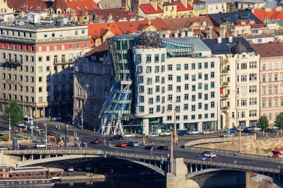 Танцующий дом в Праге, Чехия Это необычное офисное здание построили архитекторы Владо Милунич и Фрэнк Гери в 1996 году. В шутку это архитектурное сооружение называют "Дженифер и Фрейд", в честь знаменитой танцующей пары из одноименного фильма. Та часть здания, что расширяется кверху, олицетворяет Фрейда, а сторона с "тонкой талией" и развивающейся книзу "юбкой" — это Дженифер.
