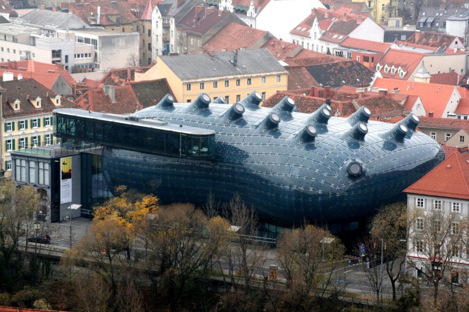 Галерея современного искусства Кунстхаус в Граце, Австрия Открыта в рамках программы "Культурная столица Европы" в 2003 году. Концепт здания разработали лондонские архитекторы Питер Кук и Колин Фурнье. Здание построено в стиле "блоб", резко контрастирующем с окружающей застройкой, и напоминает своим видом сердце робота.