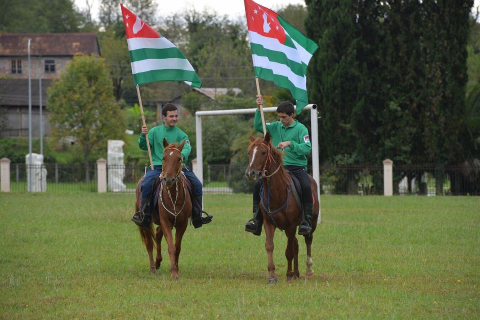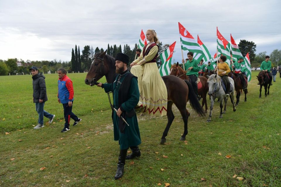 Праздник начался с шествия всадников, которые несли в руках абхазские флаги.