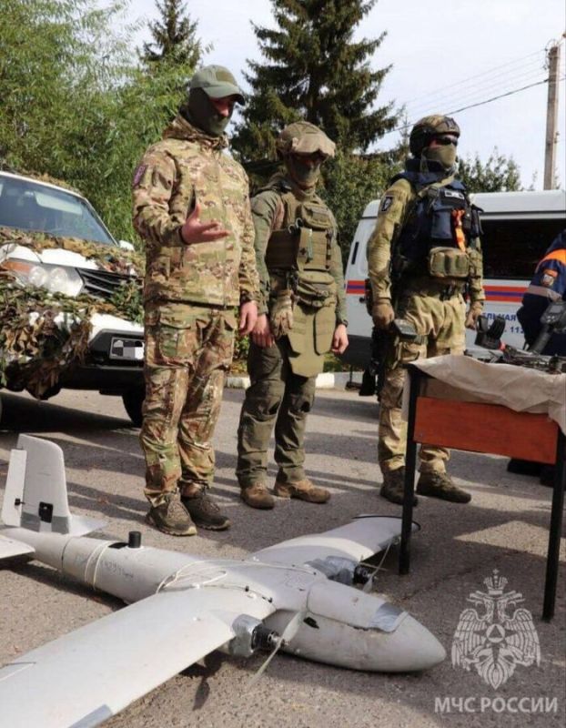 "Среди трофеев — дрон-бомбардировщик "Авенджер". Он может нести боеснаряд весом до 4 кг, изготовлен из стекло-углеродного композита. Это так называемый многоразовый беспилотник, может лететь на высоте до 1500 метров со скоростью 80 км/ч", — рассказал начальник группы сводного пиротехнического отряда МЧС России с позывным Илай.