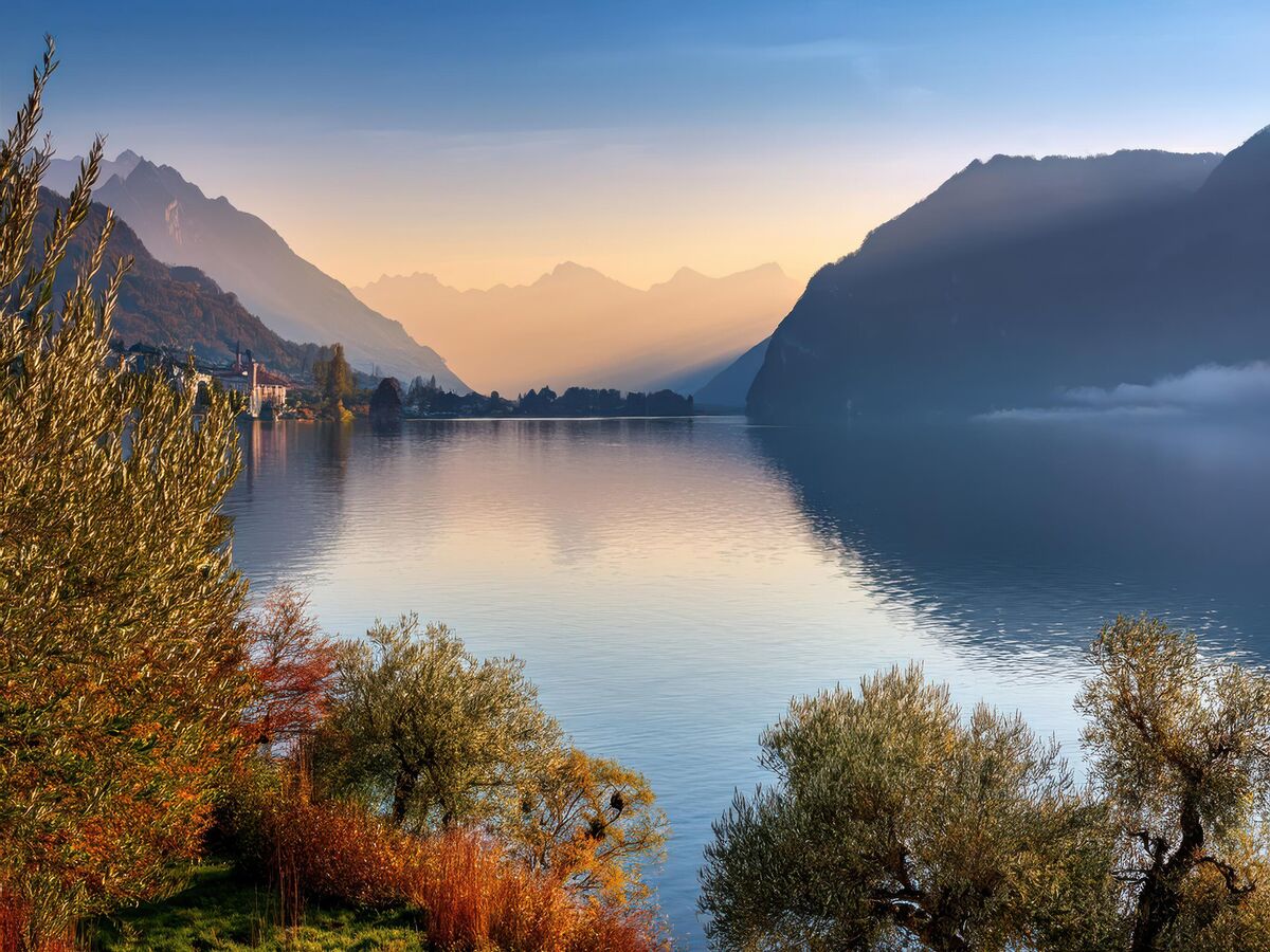 Безмятежное озеро и горный пейзаж на закате с осенней листвой, Лугано, Швейцария.