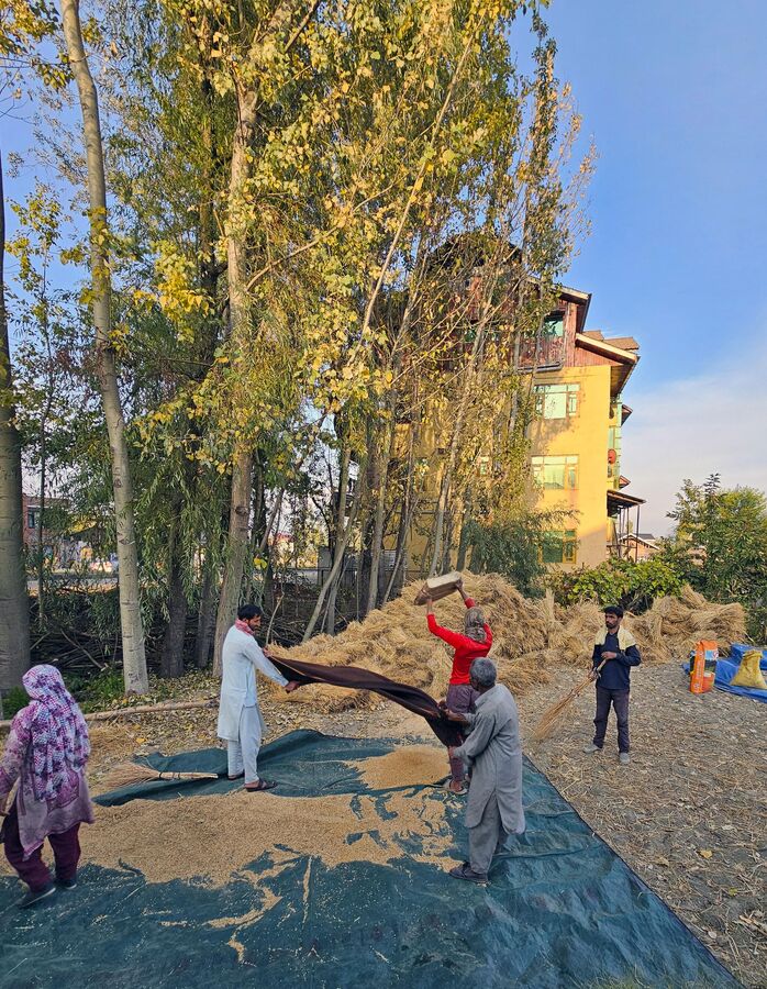 Баден-Вюртемберг, Ридлинген. Фермер проезжает мимо деревьев, окрашенных в осенний цвет, с прицепом, груженным кукурузой.