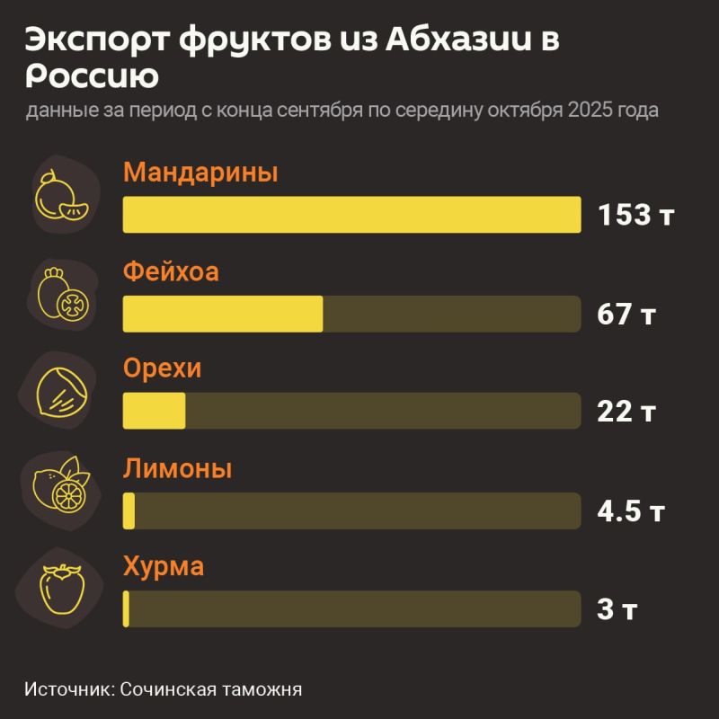 Кроме мандаринов, в Россию также завозят абхазские лимоны, фейхоа, орехи и хурму. Общий объем сельхозпродукции превысил 250 тонн.