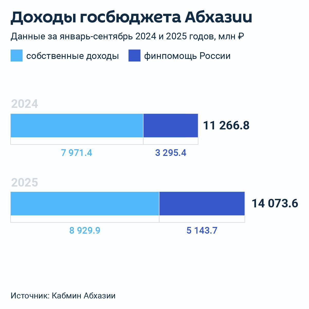 Доходы бюджета Абхазии за девять месяцев 2025 года составили 14,07 млрд рублей.