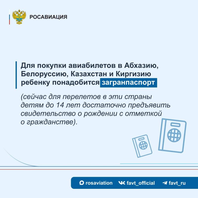 В связи с этим, приобрести авиабилеты для детей до 14 лет в Абхазию, Белоруссию, Казахстан и Киргизию можно будет только при наличии загранпаспорта.