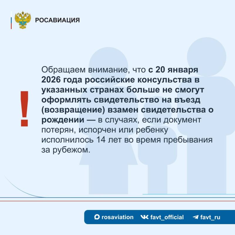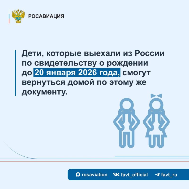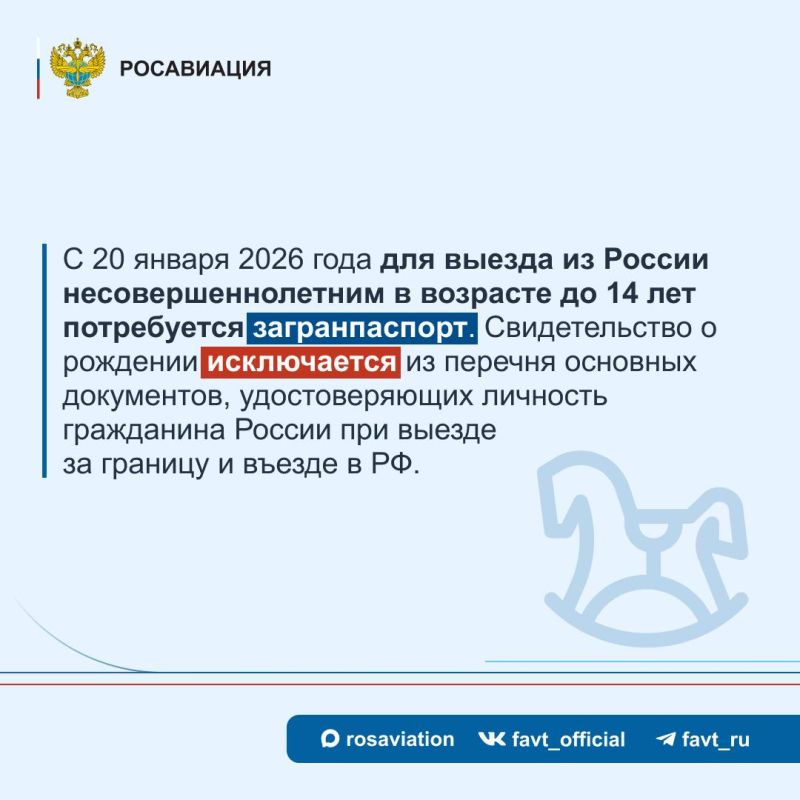 #Объясняет_Росавиация. С 20 января 2026 года вступают в силу поправки в Федеральный закон «О порядке выезда из Российской Федерации и въезда в Российскую Федерацию», согласно которым, несовершеннолетним гражданам России до..