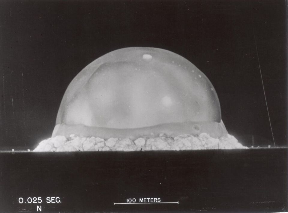 Изображение с подписью "0,025 секунды" первого ядерного испытания под кодовым названием "Тринити", проведённого Лос-Аламосской национальной лабораторией в Аламогордо, штат Нью-Мексико, около 1945 года.