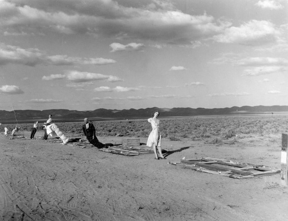 Ряд манекенов, расположенных в 7000 футах от эпицентра взрыва во время одного из ядерных испытаний, проведённых в рамках операции "Teapot" на испытательном полигоне в Неваде между февралем и маем 1955 года. Эти манекены, хотя некоторые и были повалены, не сгорели.