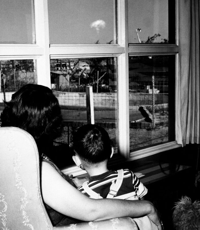 Миссис Жаклин Бак с сыном наблюдают из гостиной в Лас-Вегасе за грибовидным облаком ядерного взрыва 8 мая 1953 года на полигоне в Неваде, в 75 милях от дома. Вспышка показала, что взрыв был одним из крупнейших весенней серии испытаний. (Фото: Комиссия по атомной энергии США через AP)