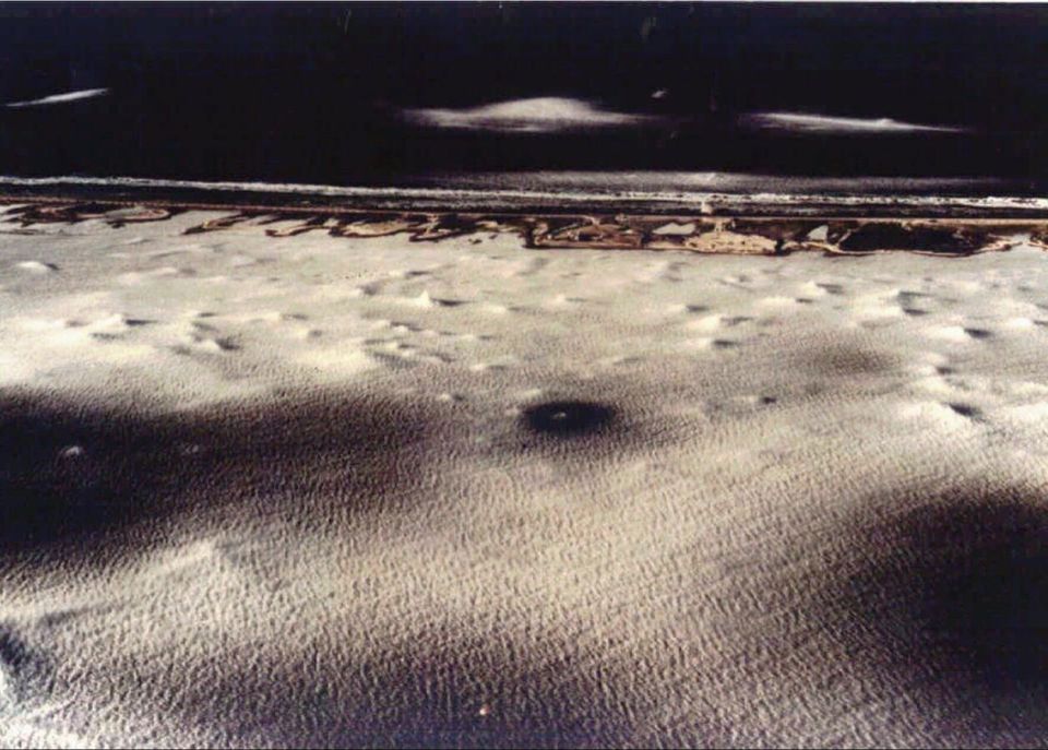 Лагуна Муруроа, Французская Полинезия, после подземного ядерного взрыва 5 сентября 1995 года. Эпицентр отмечен чёрной точкой, воды вокруг побелели. Испытание началось несмотря на международные протесты и положило начало серии из восьми взрывов.
