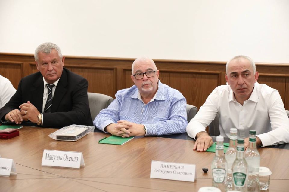 Президент Абхазии Бадра Гунба встретился с президентом Международной федерации домино Мануелем Окендо, президентом Федерации домино Венесуелы Ефрайном Веласкесом, президентом Доминиканской федерации домино Хуакином Мартинесом и президентом Федерации домино России Борисом Борзовым.