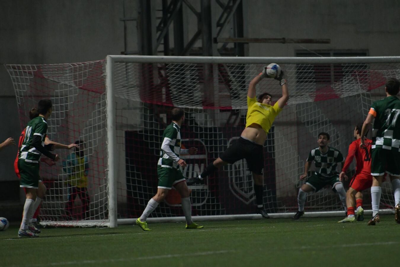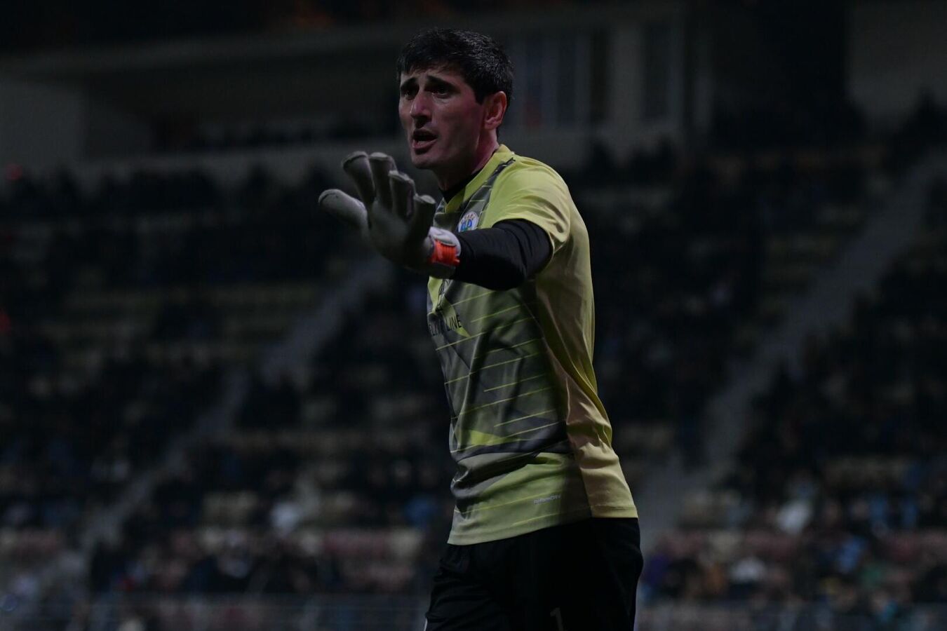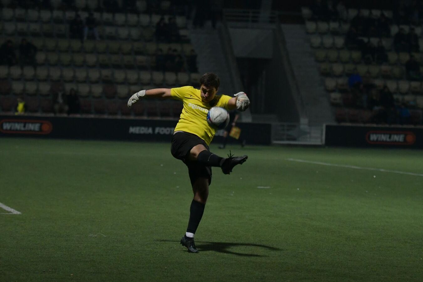 Вратарь ловит мяч после удара игрока "Бзаны".