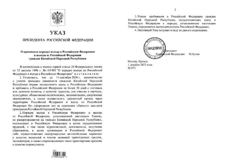 Владимир Путин подписал указ о безвизовом въезде граждан КНР в Россию.