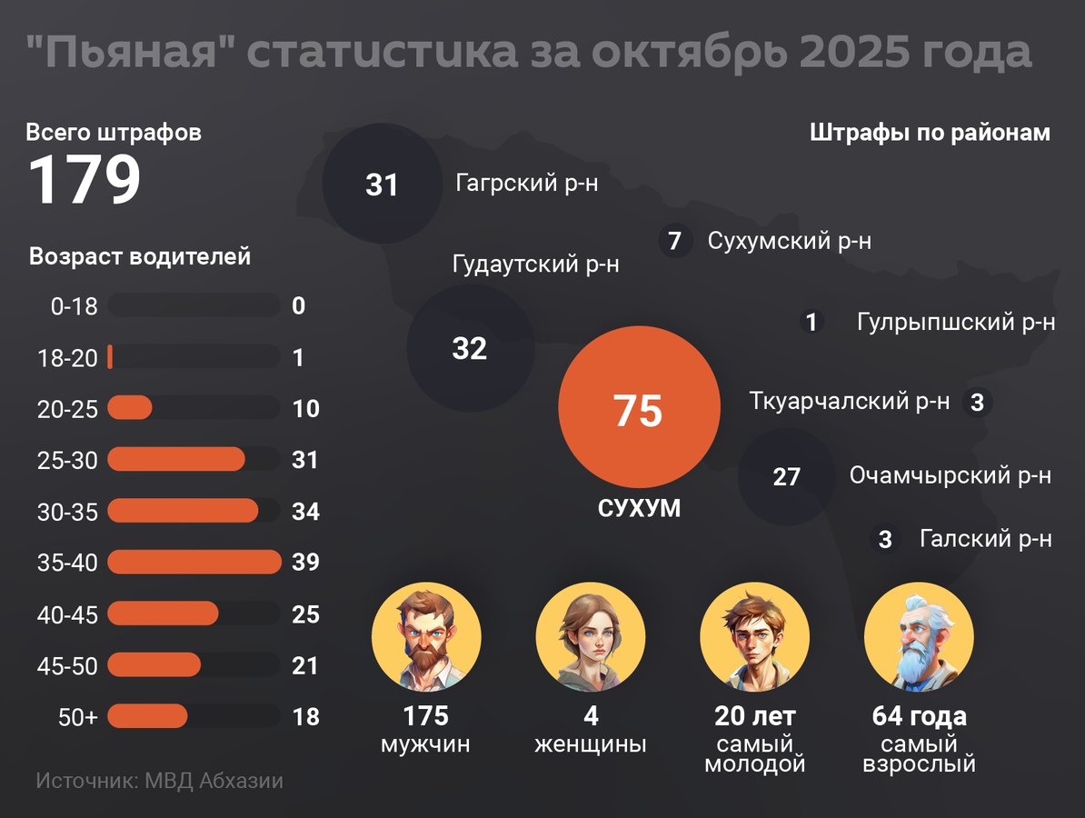 Несовершеннолетних подвыпивших нарушителей в октябре выявлено не было. Самому молодому "лихачу" было 20 лет – он из Гагры, самому старшему – 64 года. Он из Сухума. Из общего количества нарушителей чаще всего попадались на "радары" блюстителей правопорядка нетрезвые автомобилисты в возрасте от 35 до 40 лет. "Золото" за ними. "Серебро" в октябре досталось тем, кому от 30 до 35 лет, а "бронза" ушла к тем, кому от 25 до 30 лет.