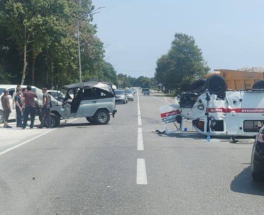 Автомобиль марки УАЗ въехал в скорую помощь, которая от удара опрокинулась на крышу, рассказал Sputnik начальник ГАИ района Анзор Базба.