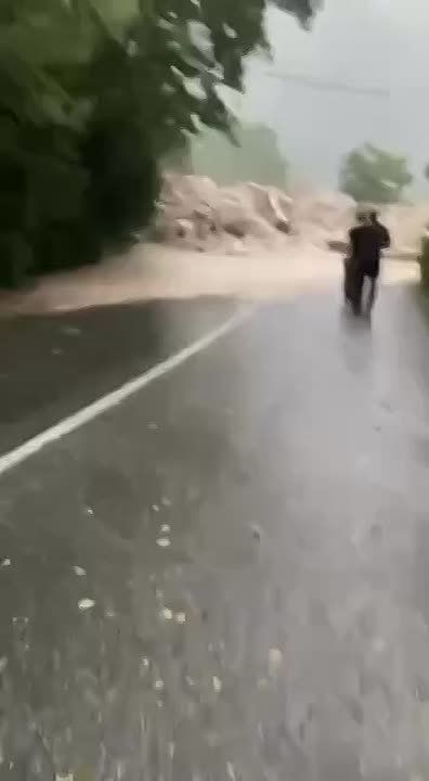 ЧП произошло на 13-м километре дороги в районе Голубого озера. Поток снес автомобиль, разрушил тарзанку.