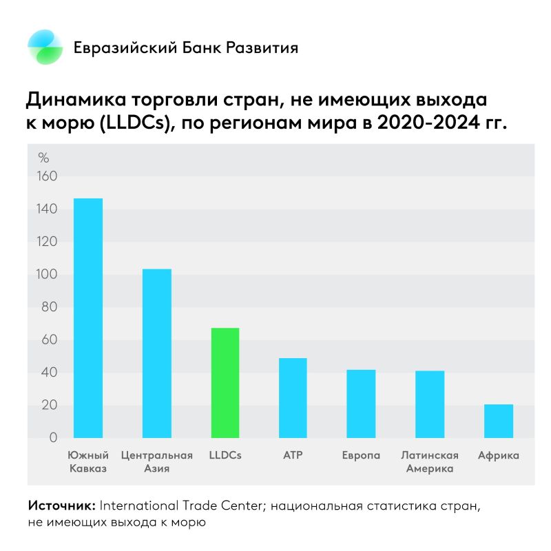 Региональные лидеры по темпам роста: Южный Кавказ +146% и Центральная Азия +103%. В 2024 г. эти два региона совместно сформировали 55% общего товарооборота стран, не имеющих выхода к морю, что на 12 п.п. выше уровня 2020г.