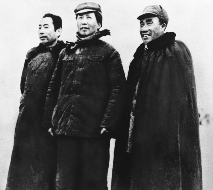 Мао Цзэдун (в центре) позирует с Чжоу Эньлаем (слева) и Чжу Дэ (справа) на военной базе китайских коммунистов в Яньани, Китай, 1945 год.