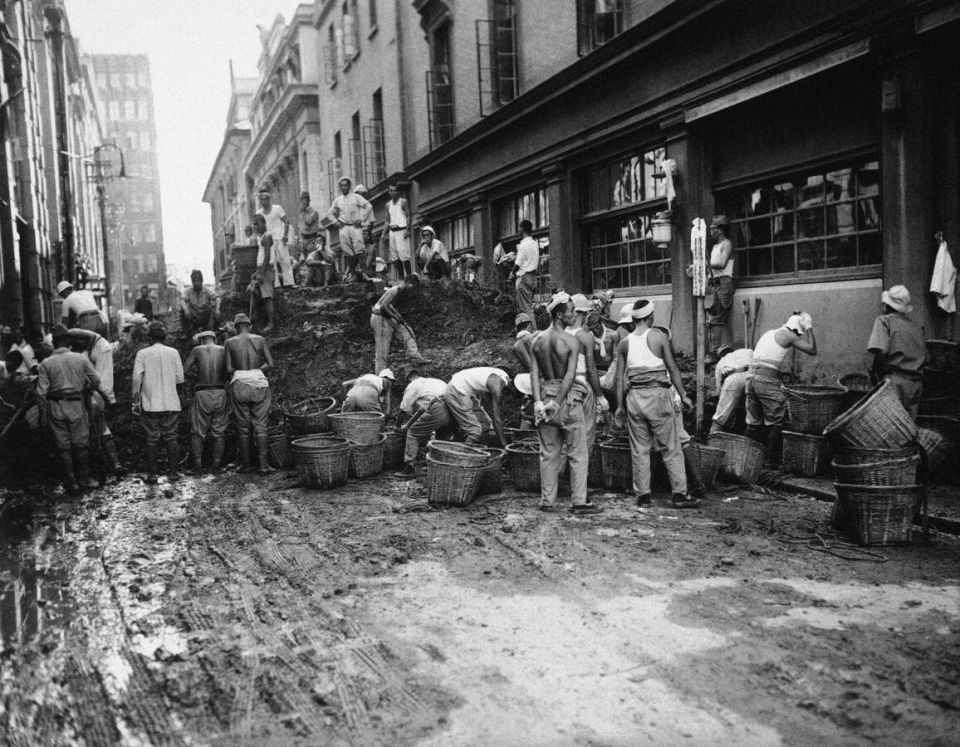 Японских рабочих в Шанхае, Китай, 16 октября 1945 года заставили разбирать один из баррикад, которые они ранее построили в ожидании вторжения союзников.