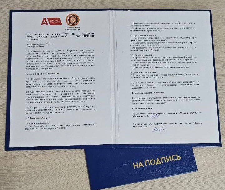 Армянская община Республики Абхазия и общественное движение "Абхазия будущего" подписали «Соглашение о сотрудничестве в области гуманитарной, культурной и молодежной политики". Это событие стало важным шагом к развитию и укреплению межнационального диалога.