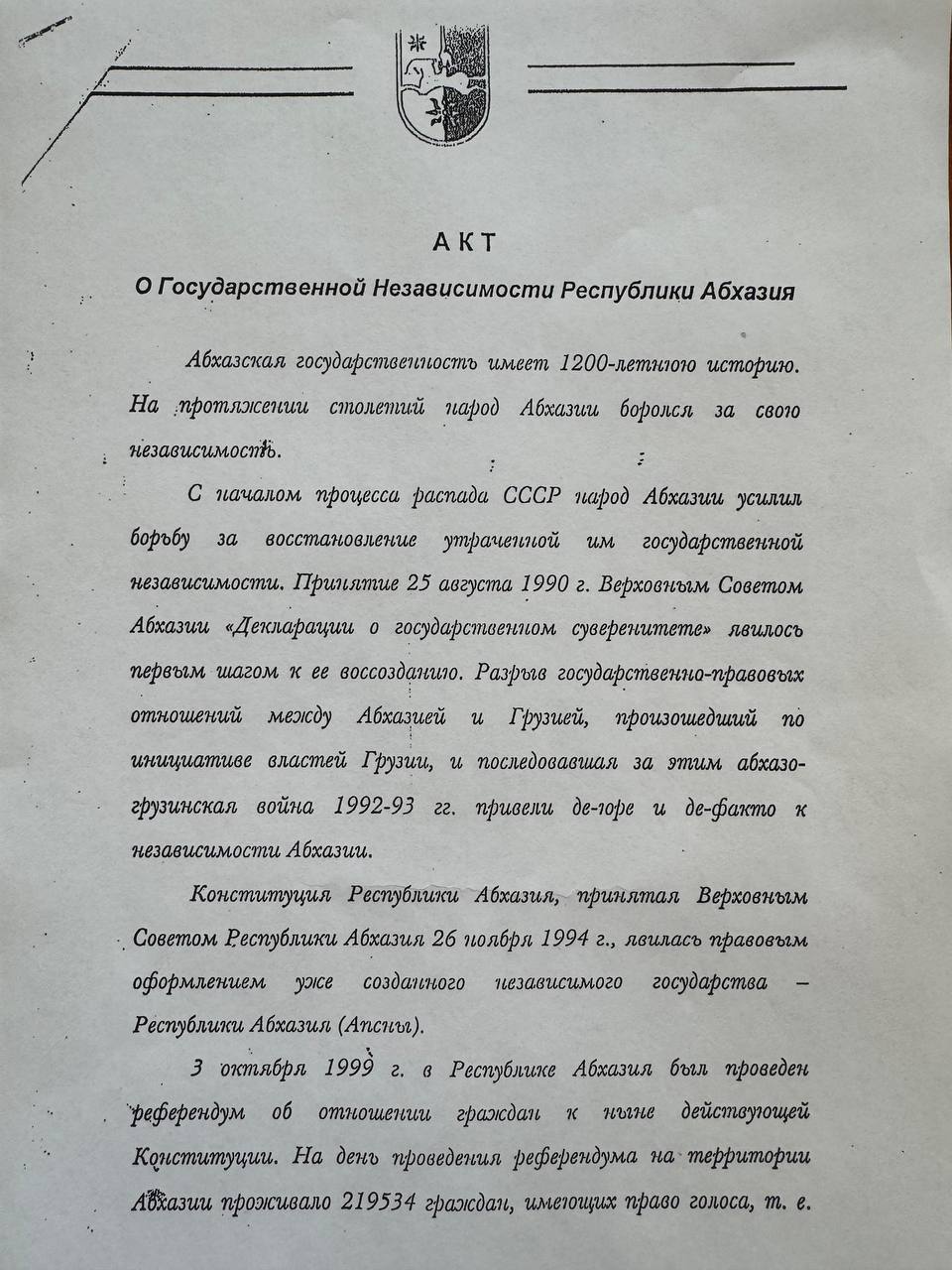 Акт "О государственной независимости Республики Абхазия" был утвержден Парламентом 12 октября 1999 года