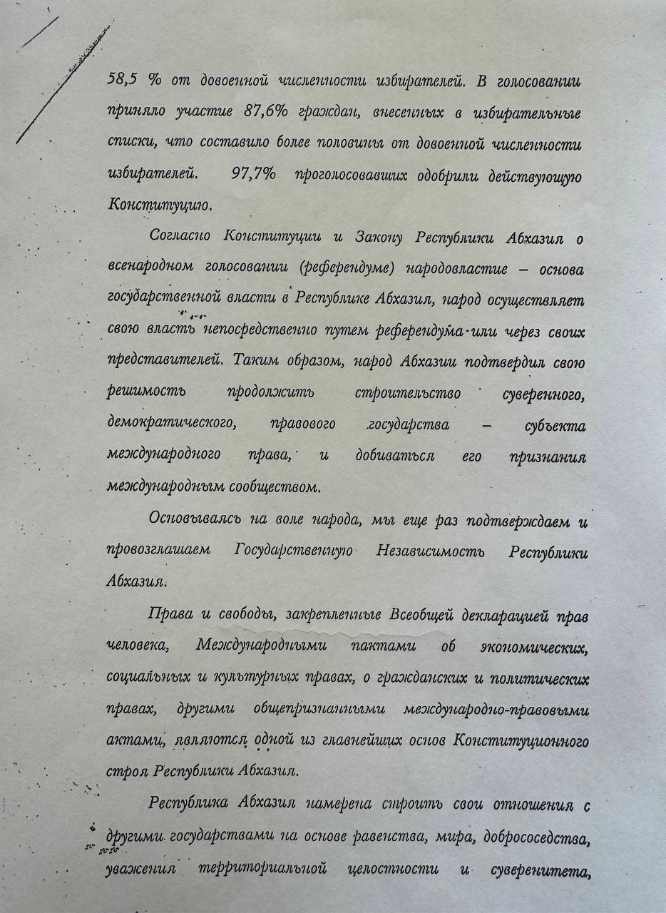 Он стал итогом многолетнего пути народа Абхазии к восстановлению государственной самостоятельности. В нем зафиксировано историческое право республики на независимость, подтвержденное итогами референдума 3 октября 1999 года, на котором подавляющее большинство граждан поддержали действующую Конституцию страны.