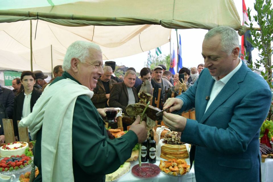 Первым он зашел к хозяевам фестиваля, представителям села Лыхны, где его угостилинациональными блюдами и традиционным абхазским вином.