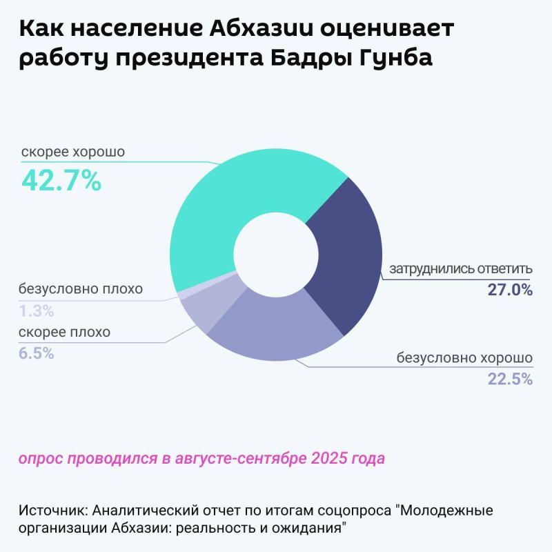 На вопрос "Как вы считаете, президент Республики Абхазия Бадра Гунба работает на своем посту хорошо или плохо?" 42,7% ответили "скорее хорошо" и 22,5% — "безусловно хорошо".