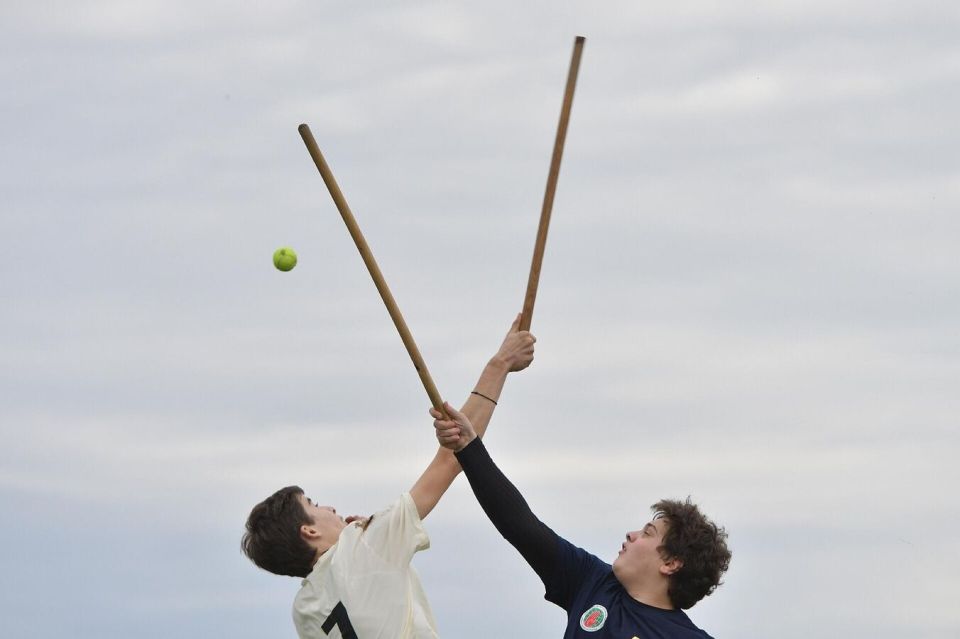 Капитаны команд сбивают деревянными палками мяч, игроки должны добежать до финиша и не попасться соперникам.
