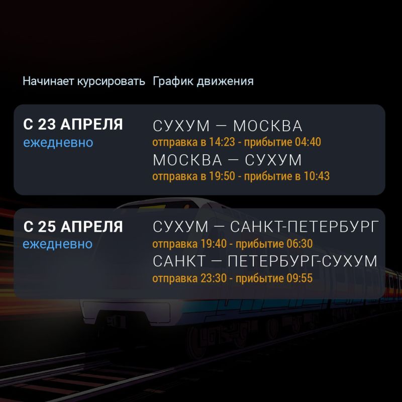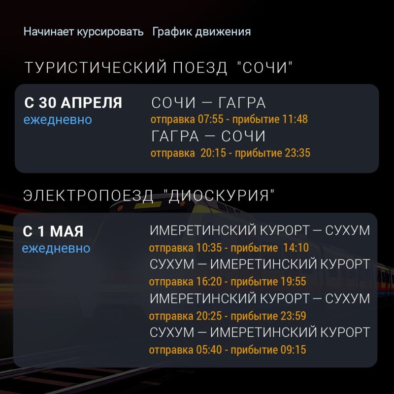 Электропоезд "Диоскурия" начал курсировать дважды в день 1 мая 2025 и перевез более 130 тысяч пассажиров. Ранее рейс № 929 отправлялся в 20:25 и прибывал в 23:59, а рейс № 930 — в 05:40 и прибывал в 09:15.