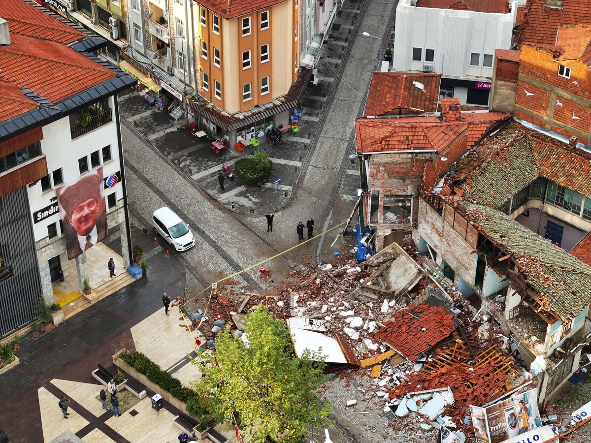 Вид с воздуха на обрушившееся здание после землетрясения в турецком районе Синдирги