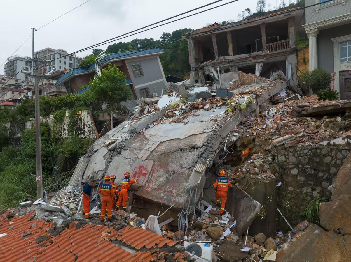 Спасатели работают на месте оползня, вызванного дождем, в деревне Даяуан, Китай. Они извлекли девять человек из завалов, двое из которых были подтверждены погибшими, после того как оползень, вызванный дождем, заблокировал 14 человек