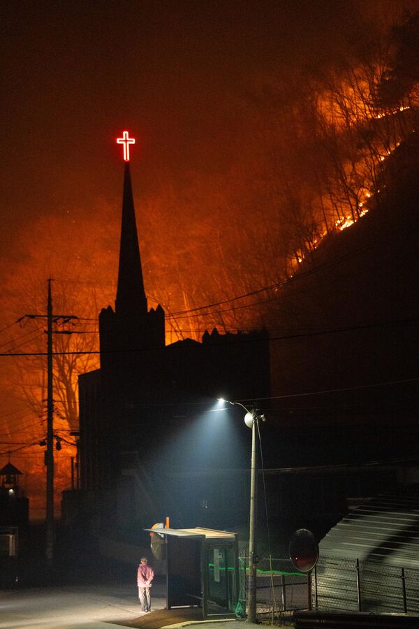 Вид на лесной пожар, распространяющийся по южнокорейскому городу из-за сильных ветров