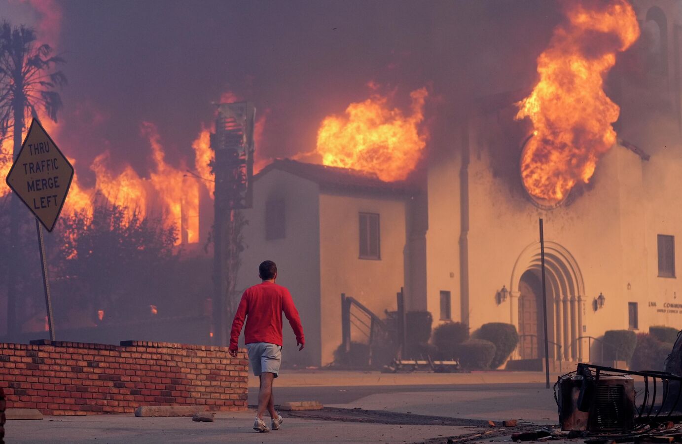 Мужчина идет перед горящей церковью сообщества Альтадены, в Пасадене, Калифорния